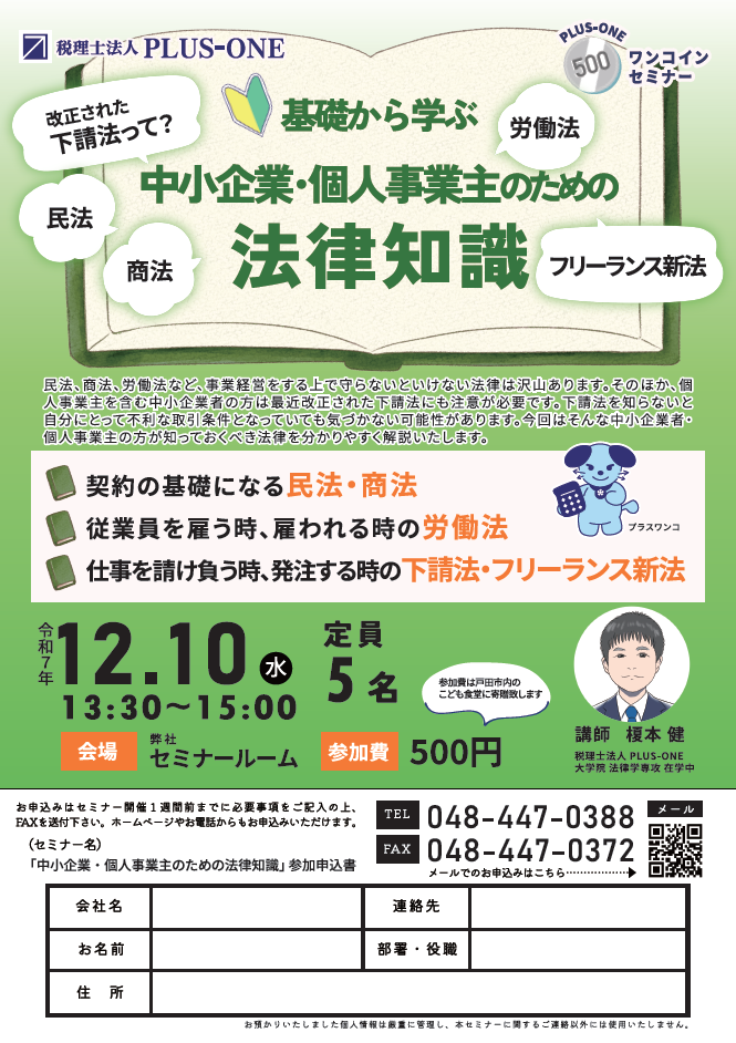 【2025年12月10日(水)開催】ワンコインセミナー 基礎から学ぶ中小企業・個人事業主のための法律知識